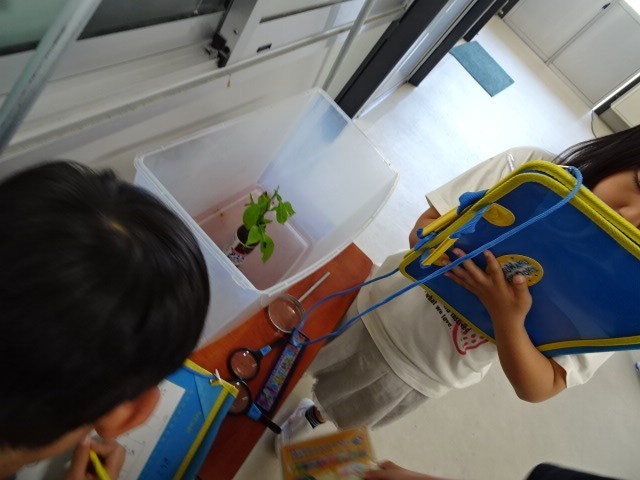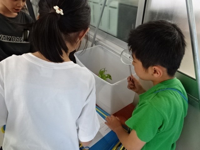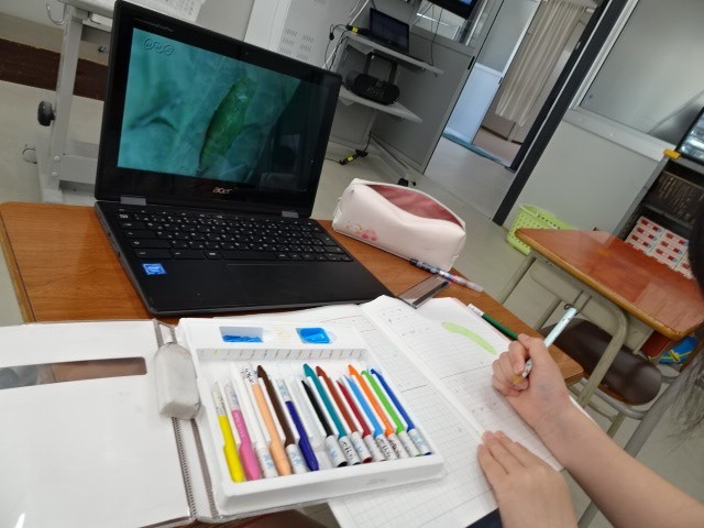 理科では、チョウの変体について学習しています。今日は実際のチョウの幼虫を観察しながら、クロムブックの動画で理解を深めました。
