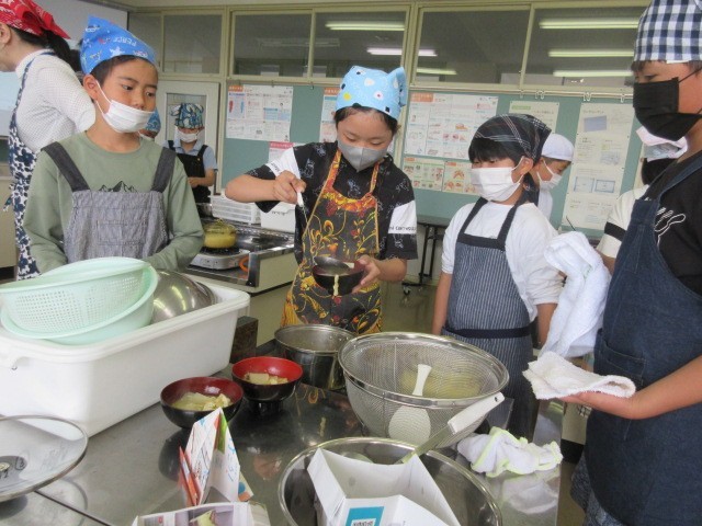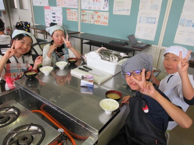 ごはんと味噌汁を作り、「ごはんが柔らかすぎた」「大根がまだかたいなあ」と、調理する難しさを感じながら取り組んでいました。宿泊学習では、野外炊飯で自分達のお昼ご飯を作ります。今日よりの反省を活かしながら、みんなで協力して頑張ります!