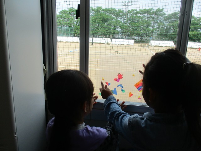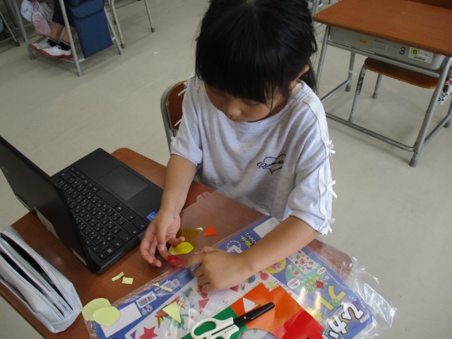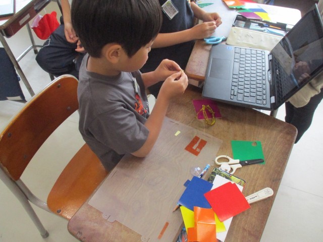図画工作科では、光にあててできる影から作品を作っています。日光を通したときにきれいに見えるように窓ガラスに当てながら工夫したり、友達と相談したりしながら作品づくりを進めています。