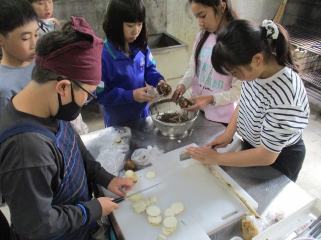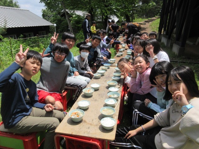 5年生の宿泊学習では、ご飯を炊いて、豚汁を作りました。一人一人が役割を意識して取り組み、おいしいご飯を作ることができました。