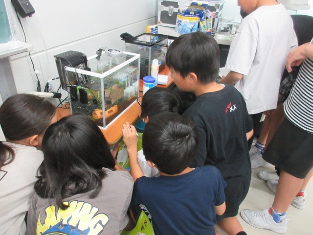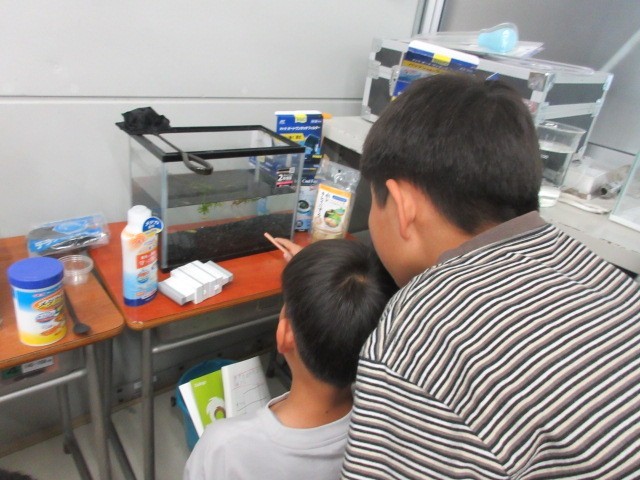 理科室のメダカをじっと見つめて「どれがめすで、どれがおすかな」「おなかが膨らんでいるから、たまごがいるんじゃないかな」と、予想しながら授業に取り組む子供たちでした。