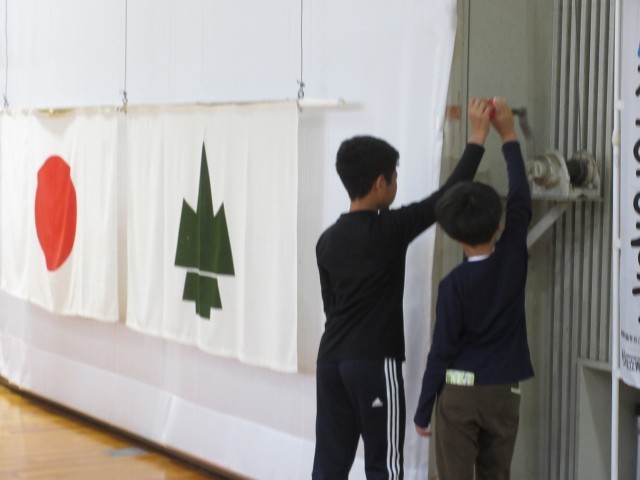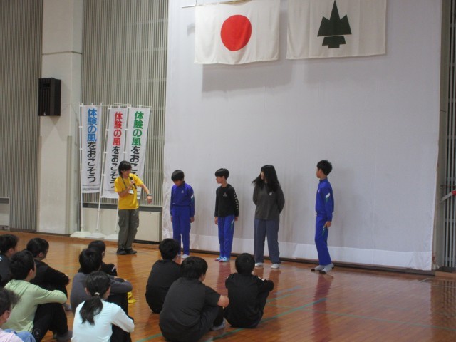 2日目の朝のつどいの様子です。活動紹介や国旗掲揚をしました。参加している学校とゲームをして、交流もしました。
