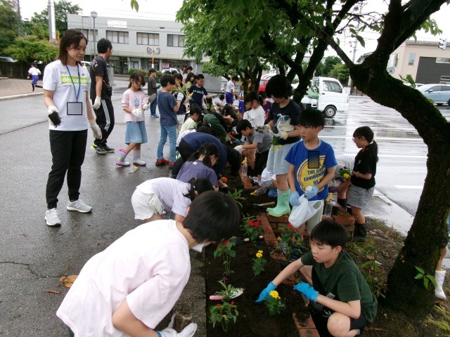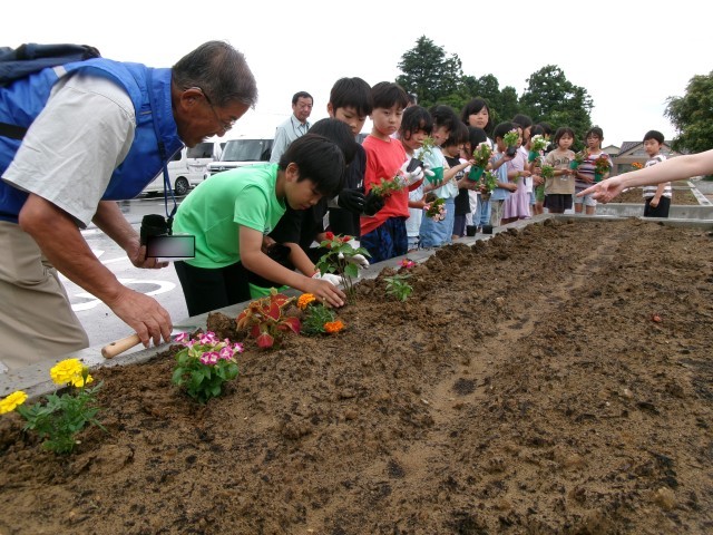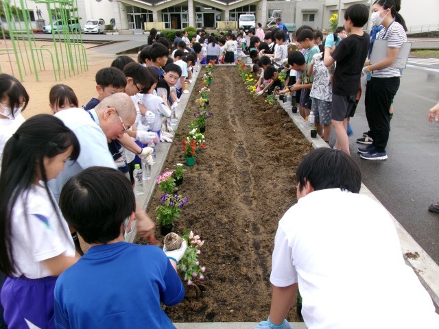贈呈式の後に全校児童で花苗を植えました。花と緑の銀行のボランティアの方にもご協力いただき、明るく素敵な花壇に仕上がったことで、子供達の笑顔も花のように咲いていました。草花の栽培体験活動を通して、生命尊重の心を育んでいく機会をいただきました。ありがとうございました。