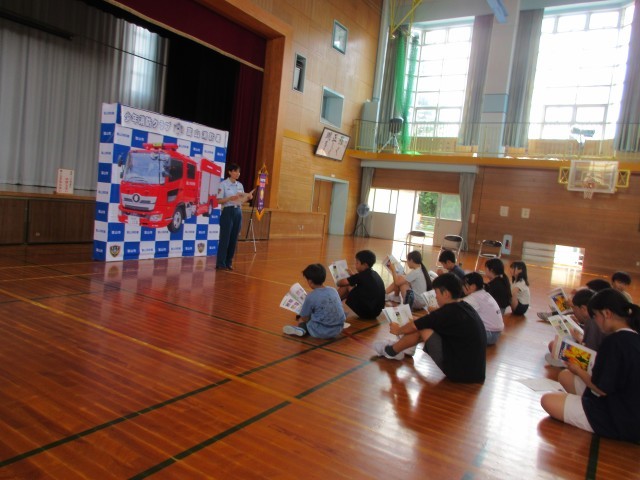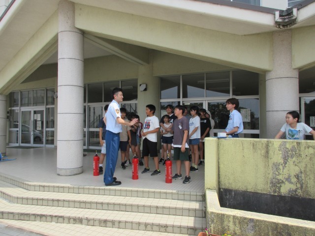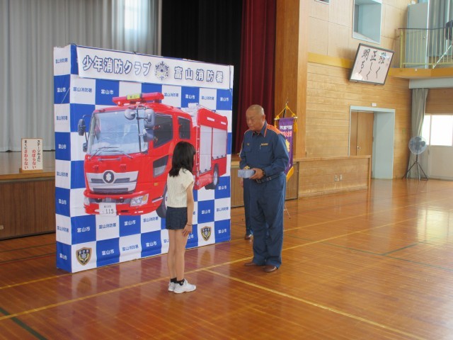 BFCバッジ授与式がありました。消防署の方から、富山市の消防クラブに参加するということでバッジを授与していただきました。その後、火の扱い方や消化器の使い方を教えていただきました。