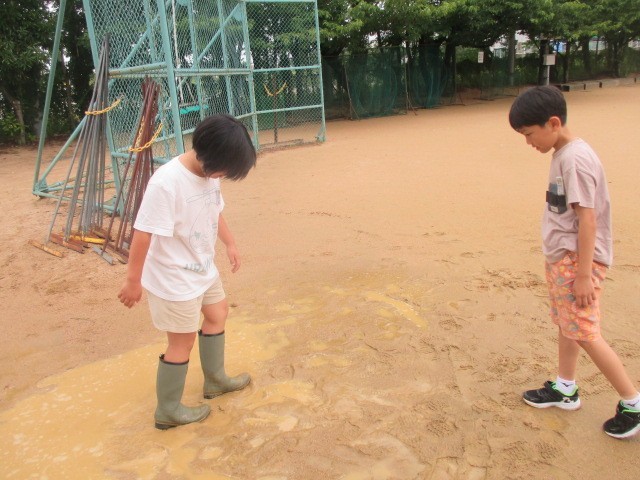 雨水の行方を調べるために教室を飛び出してグラウンドの周りに出かけている様子です。