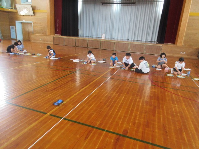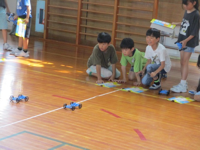 理科では、風やゴムのはたらきについて学習しています。今日は、ゴムを伸ばす長さによって、車が動く距離に違いがあるのか実験をしました。