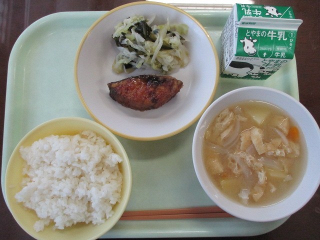 ごはん、牛乳、ふくらぎのかば焼き、酢の物、みそ汁