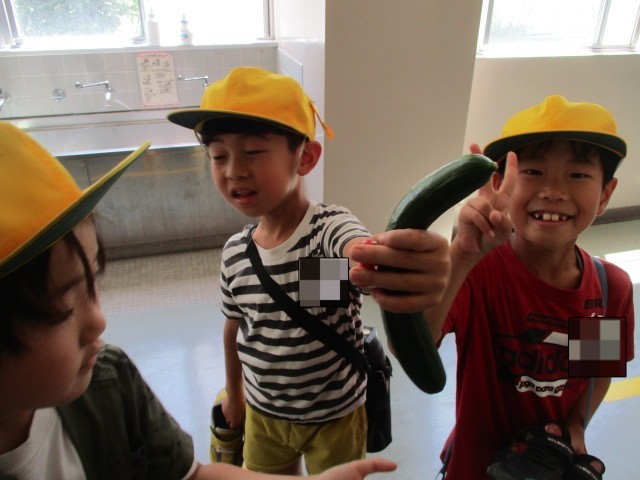 りっぱななすを家族でどうやって食べようかな。ミニトマト1個は、給食の時間に食べて、もう1個は、家族にあげるなど、自分が育てた野菜をうれしそうに見せてくれる2年生でした。