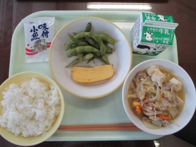 ごはん、牛乳、厚焼き卵、枝豆、韓国風すき焼き、味付け小魚