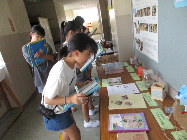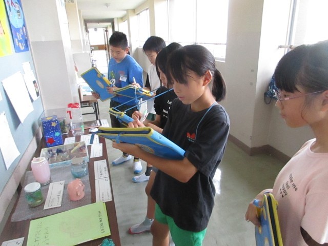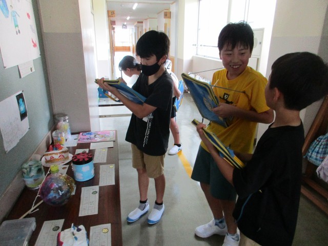 夏休みにチャレンジしたことを各クラスの掲示コーナーに行き鑑賞しました。様々な作品を触れ、よさを発見することができました。