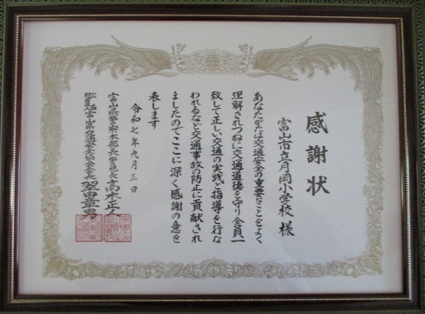 昨日3日(水)に行われた「交通安全フォーラム・富山県交通安全県民大会」で月岡小学校が「交通安全功労団体(学校の部)」で感謝状をいただきました。学校が代表していただきましたが、これは、学校だけでなく、地域・育友会などが一体となって、子供たちの命を守る交通安全教育、指導、見守り、交通環境改善などに取り組んできたことが認められたものだと思います。これからも「自分の身は自分で守る子供に育てる」をキーワードに交通安全教育をさらに進めていきたいと思います。日頃より月岡っ子の命を守る交通安全活動に取り組んでいただいている月岡校下交通安全自治会はじめ地域の皆様にあらためて感謝申し上げます。