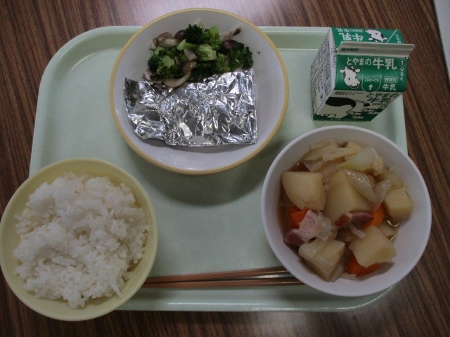 ごはん、牛乳、さばの銀紙焼き、ブロッコリーときのこのソテー、ベーコンとジャガイモの煮物