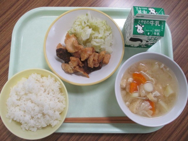 ごはん、牛乳、鶏肉とレバーのあまからめ、そえ野菜、五目みそ汁