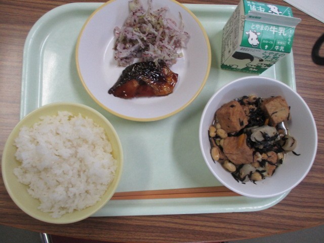 ごはん、牛乳、鯵のみりん焼き、ゆかり和え、大豆の磯煮