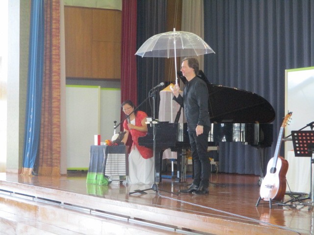 3人の音楽家、ピアニスト(フランス在住)、ギターリスト(フランス在住)、歌手(イタリア在住)をお招きし、素敵なコンサートを行いました。百人一首の短歌を歌詞にして、その短歌に合う曲をつけてピアノ、ギターの演奏で、クラシック調であったりジャズ風であったりと、日本古来の文化と外国の文化が調和した世界がつくり出されました。また、歌の前に月岡っ子が一つ一つの短歌を詠み上げ、百人一首の世界をつくりました。最後に全校で「さんぽ」を合唱し、3人の方とコラボレーションしました。