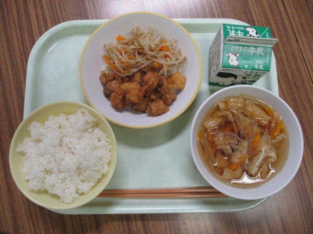 ごはん、牛乳、鶏肉のねぎソースかけ、沢煮椀