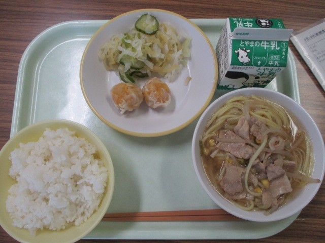 ごはん、牛乳、にんじんシュウマイ、あわせ和え、札幌ラーメン