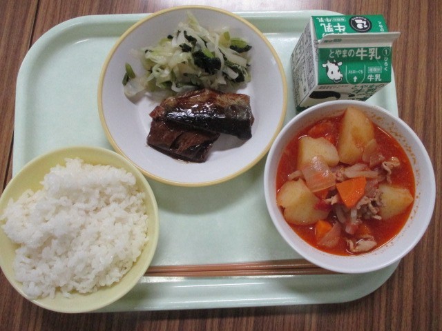 ごはん、牛乳、にしんの照り焼、しょうがひたし、トマト肉じゃが