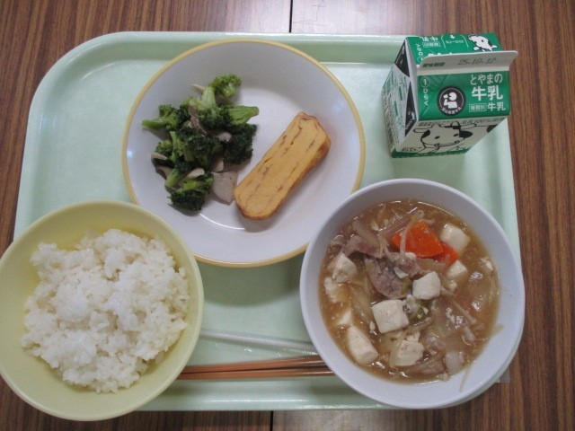 ごはん、牛乳、厚焼き卵、ブロッコリーとエリンギのソテー、豆腐の野菜あんかけ