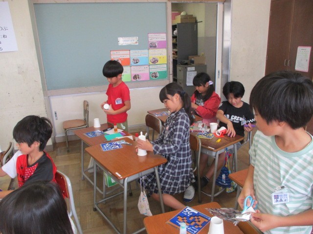 2年生が、紙コップと輪ゴムを使って飛び出すおもちゃをつくっていました。子供たちのたのしい授業はどんな時のアンケートでは、「図画工作科」が№1です。自分がつくりたいものを試行錯誤しながらつくっていく過程がたのしいのだと思います。