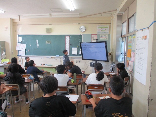 6年生は、スライド機能を使って地震について調べたこと、学んだことをプレゼンしていました。一人1台端末がなかったころは、画用紙や模造紙にかいて発表していましたが、今は、画像を取り込んだり、いろいろデザインしたりすることができ、表現の方法が大きく広がりました。