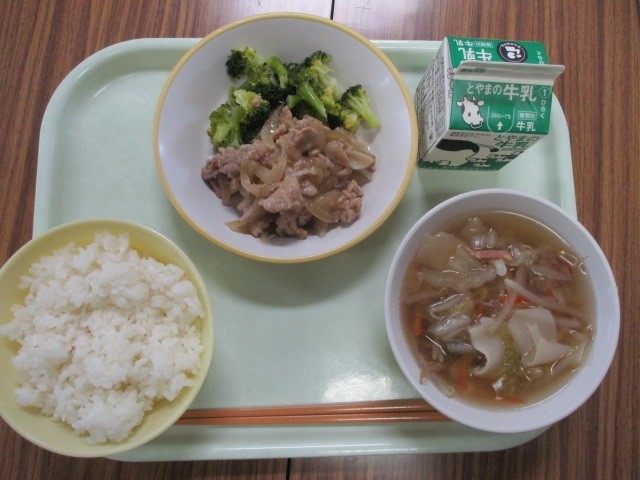 ごはん、牛乳、豚肉のおろし炒め、ゆでブロッコリー、ワンタンスープ