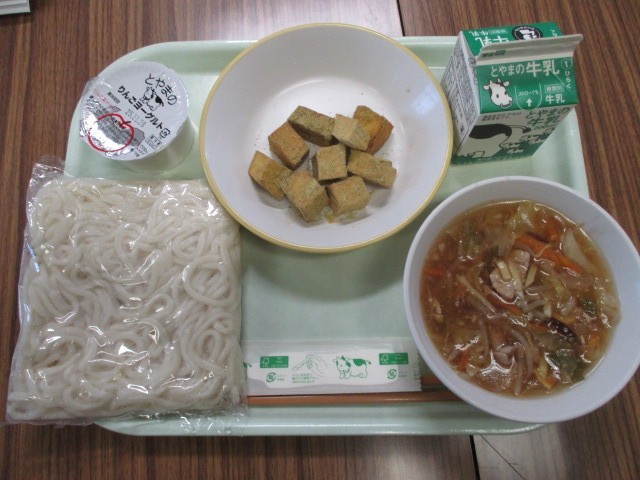 ソフト麺のとやまの五目あん、牛乳、さつまいものきなことくわの葉がらめ