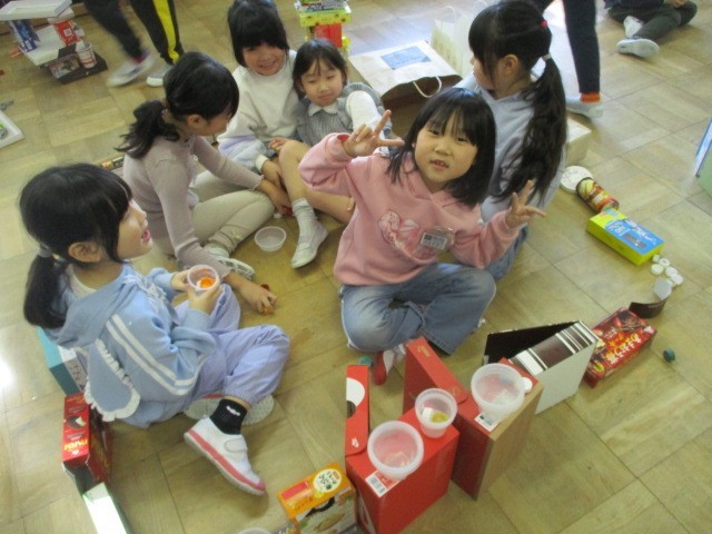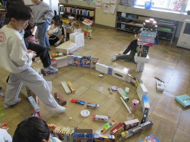 1年生は、図画工作科「はこをならべて」で、いろいろな箱を並べて、そこからイメージを広げていました。家をイメージする子、乗り物やタワーをイメージする子など、子どもの想像力は無限です。五感を使って材料のよさを感じ想像することが創造力につながっていきます。