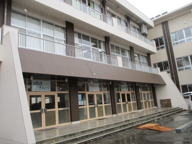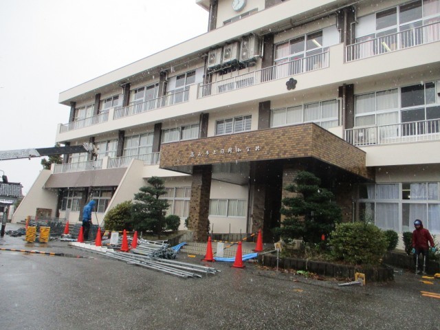 学校正面では、足場の解体が進み、久しぶりに美しくなった校舎が現われました。もうすぐ外壁リニューアル工事が終わります。長い間、ご不便をおかけしました。