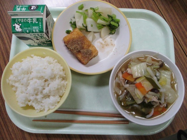 ごはん、牛乳、揚げ出し豆腐のごまだれかけ、かぶの色どり、冬野菜なべ
