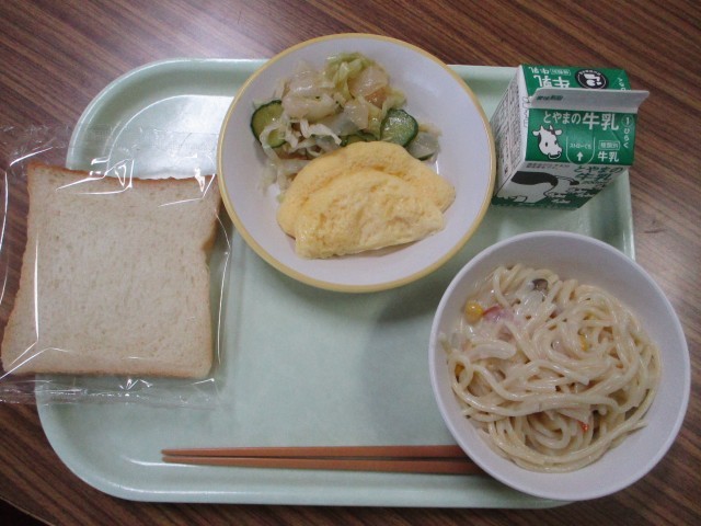 食パン、牛乳、オムレツ、こんにゃくサラダ、クリームスパゲッティ