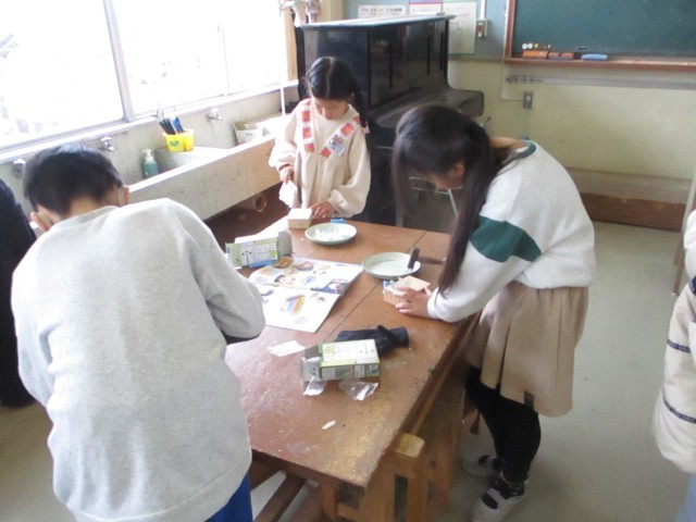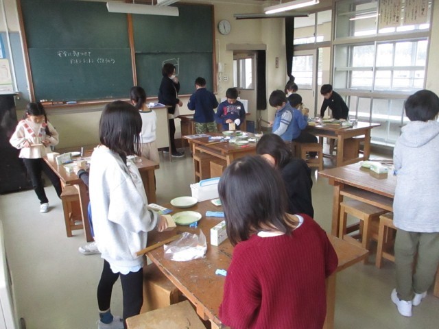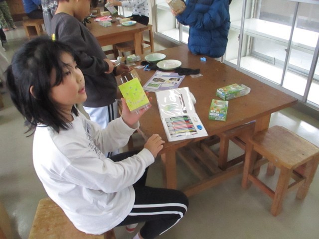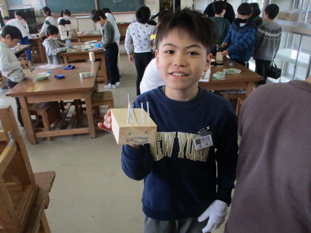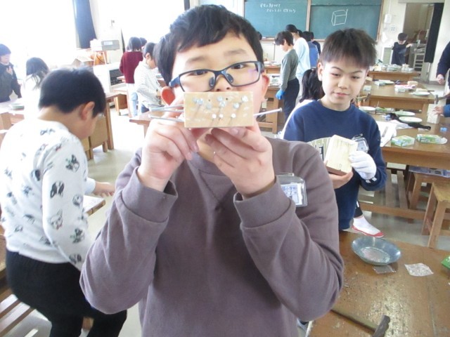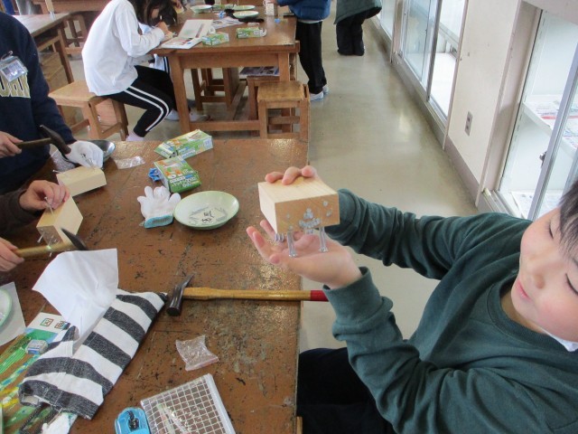 3年生が図画工作科で、くぎ打ちをしていました。くぎを打つことそのものを楽しんだり、くぎで顔などの形をデザインしたりしていました。自分が思う感じに仕上げていくことや出来たものからイメージを広げていくことも「よーく考える」です。