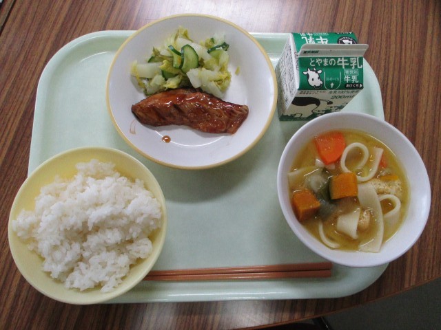 ごはん、牛乳、ふくらぎの照り焼き、柚子和え、ほうとう鍋