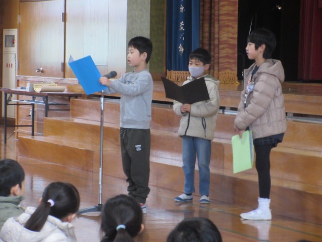 3人の月岡っ子が、2学期がんばったことを立派に発表してくれました。跳び箱運動にチャレンジしたこと、九九の練習を粘り強くしたこと、総合的な学習の時間で考えたことを全校に呼びかけたことなど、その時のがんばりがよくわかりました。