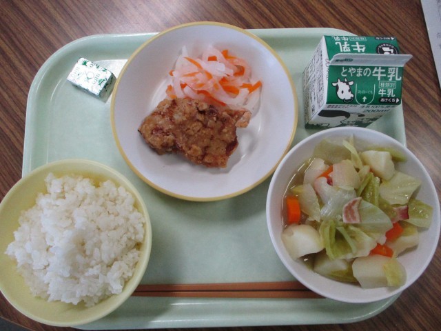 1月13日(火)今日の給食・月岡っ子 公開日 2026/01/13 更新日 2026/01/13 学校より 少なくなったけど大雪が心配されましたがさほどの雪は積もりませんでした。昨日の雨もあって中庭に少し雪が残る程度ですが、1年生は元気いっぱい。残り少ない雪を転がして雪だるまにしようとしていました。今日の給食ごはん、牛乳、豚肉の香り揚げ、ピクルス、野菜のスープ煮、ポケットチーズ 学校行事
