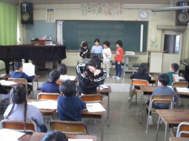 1年生は、いろいろな楽器でリズムをつくり組み合わせて曲作りをしていました。音楽でもデジタル化進んでいますが、それぞれの楽器の音を生で聞き、感じることが豊かな感性を育みます。友達の合奏についてみんなで話し合う姿も素敵でした。