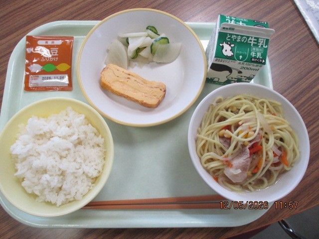 ごはん、牛乳、厚焼き卵、かぶのいろどり、サッポロラーメン、大豆ふりかけ