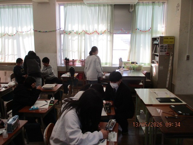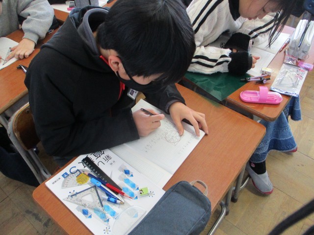 5年生(1~4枚目)どちらのクラスも算数科「正八角形を画く」でした。まずは自分で考え、その次に、話したい人を見つけ伝え合い、またグループで発表していました。