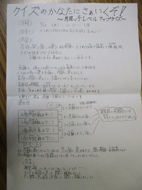 今日のロング四つ葉タイムは、6年生プレゼンツの「縦割り班対抗クイズラリー」です。2学期の「学校かくれんぼ」に続き、6年生がみんなが楽しめる企画を考えてくれました。学校の各階にあるクイズに正解しないと、次の階には進めないチャレンジ形式になっています。「いきいきチャレンジ あったかファミリー」の縦割り班活動になりそうです。