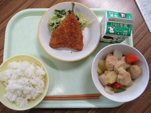 ごはん、牛乳、あじフライ、昆布和え、関東だき