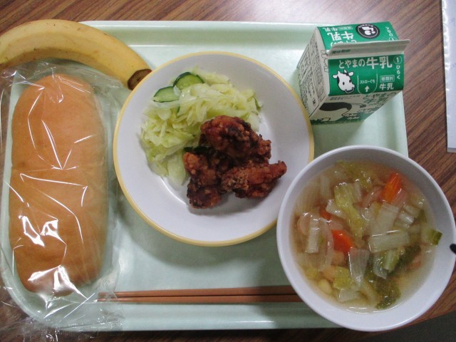 コッペパン、牛乳、鶏肉の塩こうじ揚げ、そえ野菜、ひよこ豆のスープ、バナナ