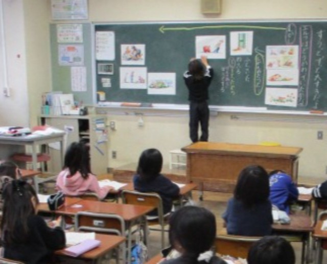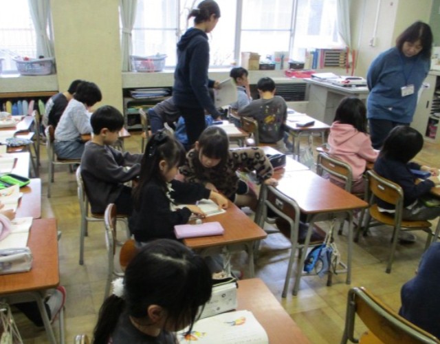 1年生が国語の学習をしていました。「ずっと、ずっと大好きだよ」という物語です。少し長い物語です。子供たちは、挿絵とそのことが書いてある叙述を探して、物語のあらすじを確かめていました。途中ですらすらと音読する声も聞こえてきて、1年生の成長を感じました。