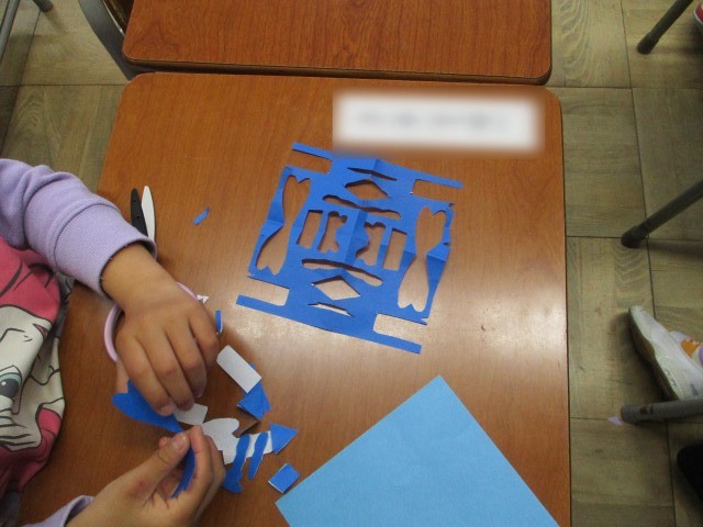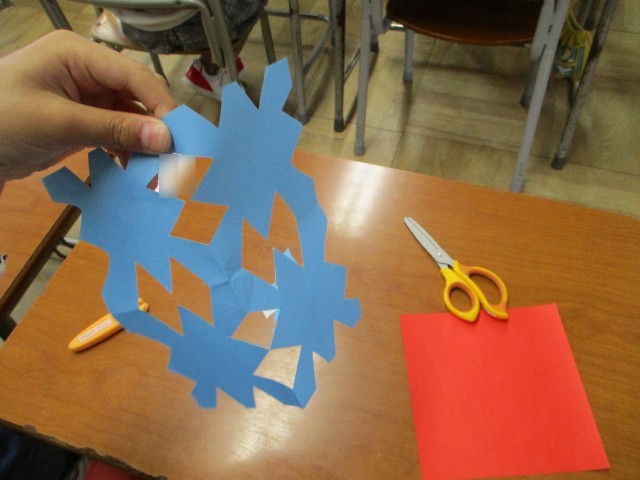 図画工作科「ちょきちょきかざり」折り紙を折ってはさみで切って開いて飾りをつくることに挑戦、どんな模様ができるかわくわくしていました。