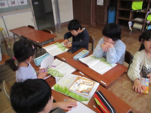 国語科「ふきのうとう」の音読の準備をグループで取り組んでいました。挿絵を準備したり、読み方を考えたりしていました。