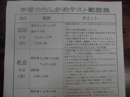 明日から2学期の「学習のたしかめテスト」です。子供たちは、1週間前に配付したテスト範囲表を見ながらそれぞれに学習に取り組んでいます。自主学習ノートに毎日5、6ページ家庭学習を続けている子、休み時間に友達と問題を出し合っている子、分からない問題を進んで教師に聞きにくる子等、取り組み方は様々ですが、どの子からもがんばろうという意欲が伝わってきます。明日は国・理、明後日は社・算の予定でテストをします。がんばりましょう!!