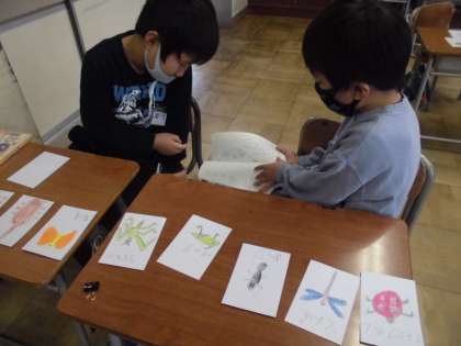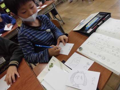 国語科「ものの名まえ」では、まとめてつけた名前と一つ一つの名前の学習をしています。「くだもの」には、「りんご」、「みかん」、「バナナ」等があります。その他にも、「のりもの」や「がっき」、「どうぶつ」とたくさん見付けた子供たち。学習したことを生かして、お店屋さんごっこをします。只今、開店に向けて準備中です!