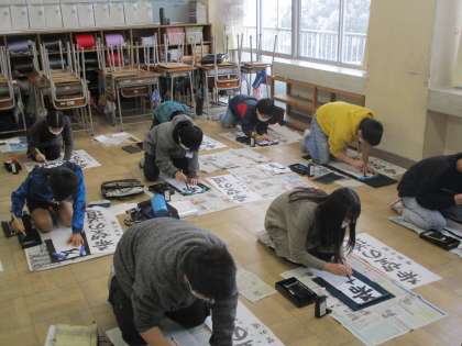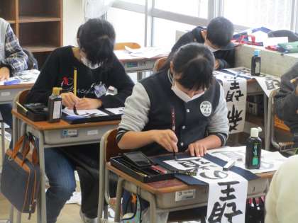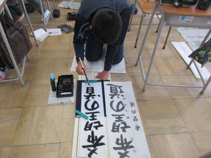 お手本をしっかりと見て、はね・とめ・はらいに気を付けて、集中して書いています。「小学校生活最後の書初大会は金賞をとりたい!」と気持ちを高めてがんばっています。懇談会に来校される方は、掲示した書き初めをぜひご覧ください。