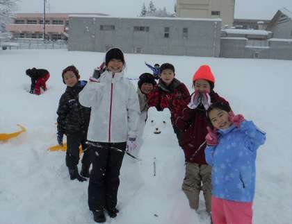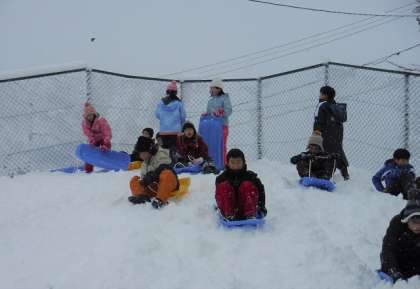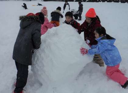 一昨日の降雪から、子供たちは雪で遊ぶことを待ち望んでいました。今日は雪遊び用の準備を万全にして、グラウンドに飛び出しました。グラウンドには、50cm位の積雪があり、築山に行くだけなのに、足腰が痛くなりました。早速そり滑りを楽しんだところで、雪だるま作りに挑戦しました。最後はかまくら作りのための雪の塊を集めていました。これぞ雪国の子供たちの遊びと言わんばかりの1時間となりました。