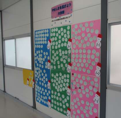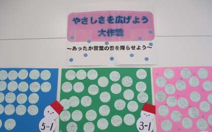 児童計画委員会による「やさしさを広げよう大作戦」では、友達の思いやりのある言葉や行動をカードに書き、廊下に掲示しています。カードには「○○さんへ 縄跳びの仲間に入れてくれて、うれしかったです」「○○さんへ 『大丈夫』と声をかけてくれて、ありがとう」などと書かれており、読んでいると温かい気持ちになります。子供たちには、人権に対する意識を高めて、月岡っ子みんなが気持ちよく毎日を過ごせるようにしてほしいと思っています。
