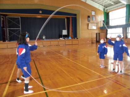 1月28日(木)に長縄跳び大会があり、色団ごとに8の字跳びをしました。2分という限られた時間内で1回でも多く跳べるように、仲間と協力してがんばりました。寒い日が続いていますが、休み時間や体育科の時間に短縄や長縄に取り組み、元気に活動しています。